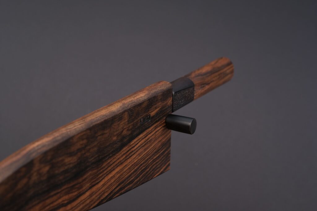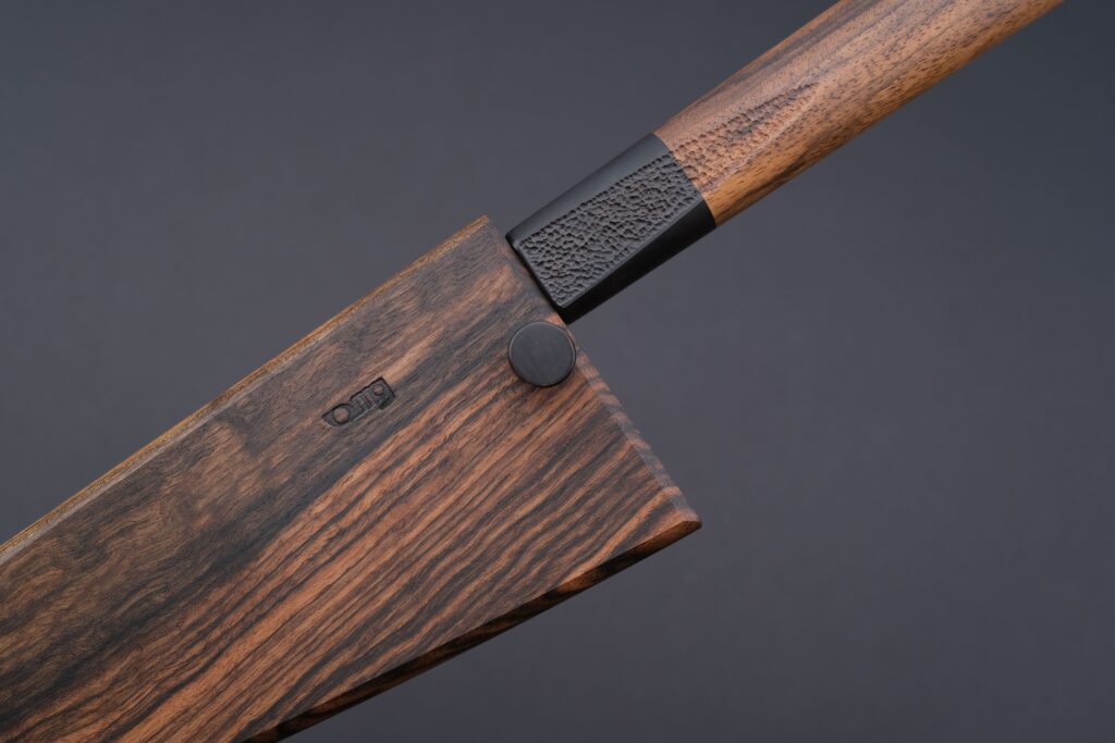 Die Scheide besteht ebenfalls aus türkischem Nussbaum und ist im Inneren mit Leder gefüttert. Sie wurde so präzise gefertigt, dass die Klinge mithilfe des Sicherungsstifts spielfrei sitzt. Dieser Sicherungsstift besteht aus einem Stück verdichtetem Nussbaumholz von Swiss Wood Solutions. Alle Holzelemente sind mehrfach mit hochwertigem Holzöl behandelt und dadurch für viele Einsätze dauerhaft geschützt.