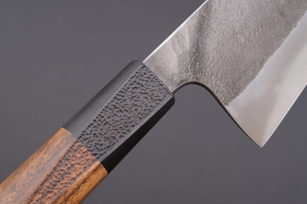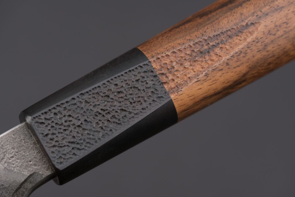 Nach dem Schmiedeprozess wurde das Messer grobgeschliffen und wärmebehandelt, einschließlich Härten und Anlassen des Stahls. Dieser Prozess sorgt für eine außergewöhnliche Verschleißfestigkeit. Der Volldamast erreicht eine durchschnittliche Härte von 66 HRC, die durch zahlreiche Messungen mit dem UCI-Härteprüfgerät Sonodur 3 exakt bestimmt wurde.
