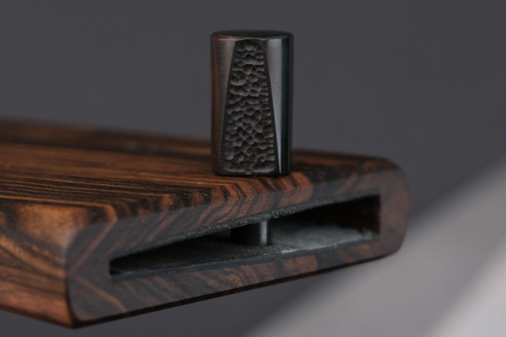 Der oval geformte Griff besteht aus türkischem Nussbaum (Hinterteil) und verdichtetem Nussbaum von Swiss Wood Solutions (Zwinge, Vorderteil). Diese Zwinge ist seitlich texturiert, um eine sichere und kontrollierte Handhabung zu gewährleisten. Dieses besondere Holz ist dank des einzigartigen Verdichtungsverfahrens extrem hart und weitgehend feuchtigkeitsbeständig.