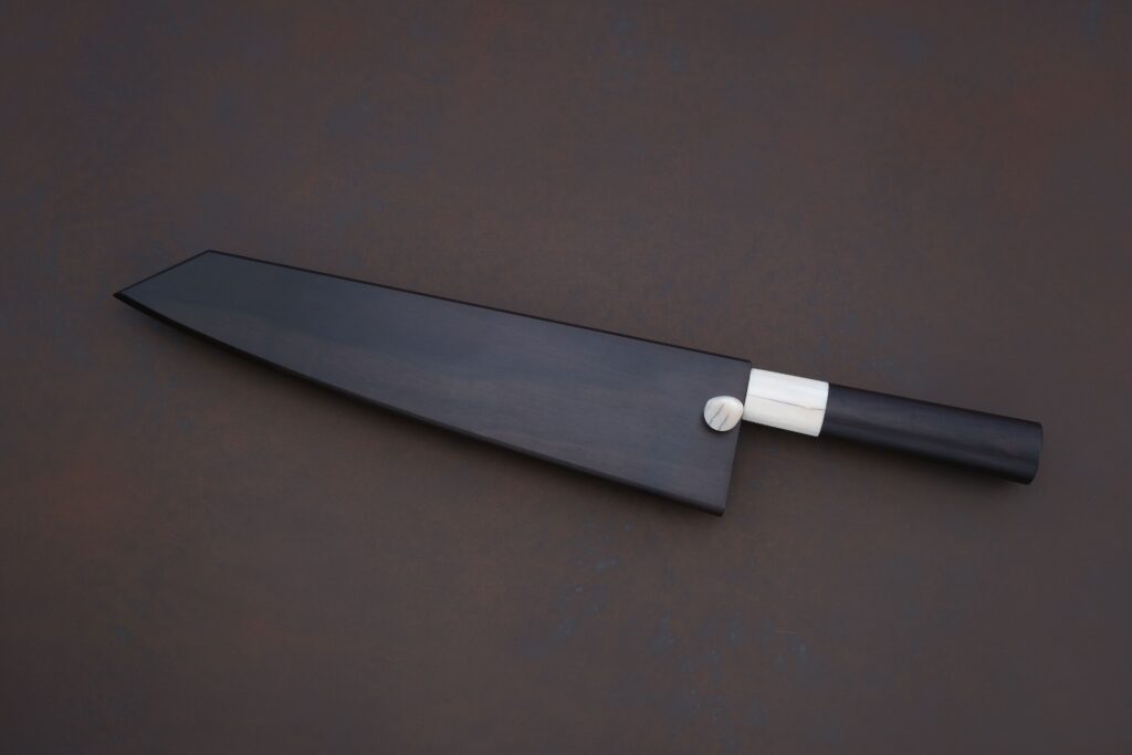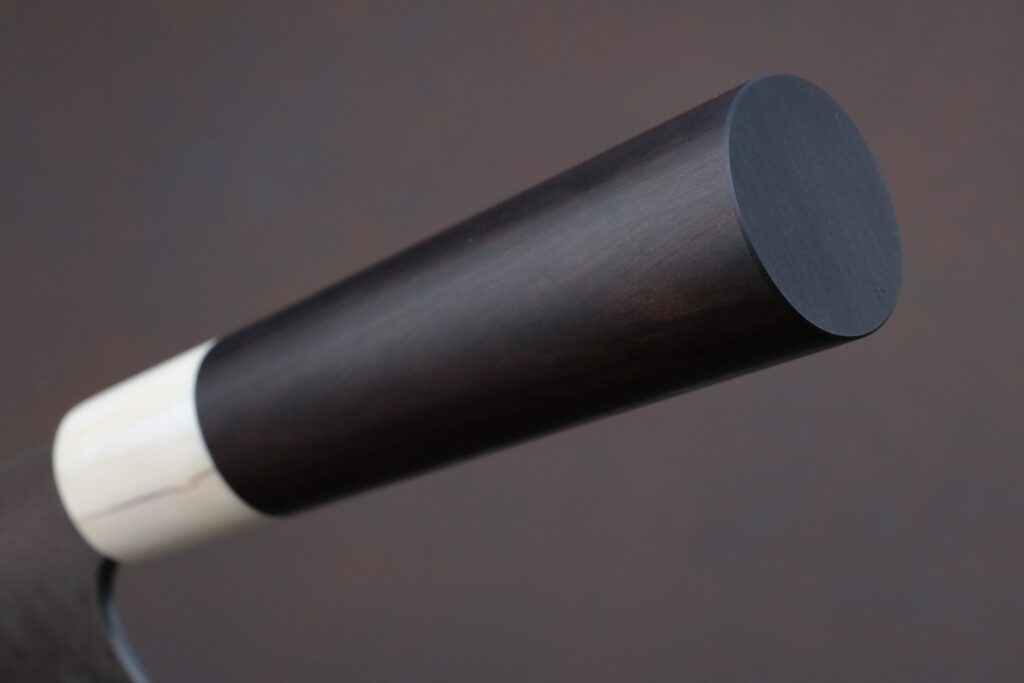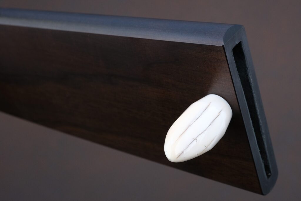 Der ovale Griff Deines Tranchier-Gemüsemessers hat die wichtige Aufgabe eine gute Kontrolle und angenehme Greifbarkeit zu ermöglichen, ohne die Bewegungsfreiheit einzuschränken. Der vordere Griffbereich, auch Zwinge genannt, besteht aus echtem Walrosszahn aus Kanada. Der hintere Teil des Griffs besteht aus Nussbaum (Bijouwood). Dieses besondere Nussbaumholz ist dank des einzigartigen Verdichtungsverfahren extrem hart und weitgehend Feuchtigkeitsbeständig. Alle Holzelemente habe ich mehrfach mit hochwertigem Holzöl behandelt, um diese für viele Einsätze zu konservieren. Die Scheide besteht aus selbigem Nussbaumholz und ist derart präzise gefertigt, dass die Klinge spielfrei sitzt.