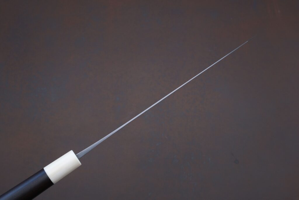 Die extreme Schärfe wurde mit der präzisen Schleifvorrichtung NOWI PRO von Katocut erreicht. Dabei kamen sowohl synthetische als auch japanische Natur-Wasserschleifsteine zum Einsatz. Der Schärfwinkel wurde auf 16.5 Grad pro Seite festgelegt, um optimale Schneideigenschaften zu gewährleisten.