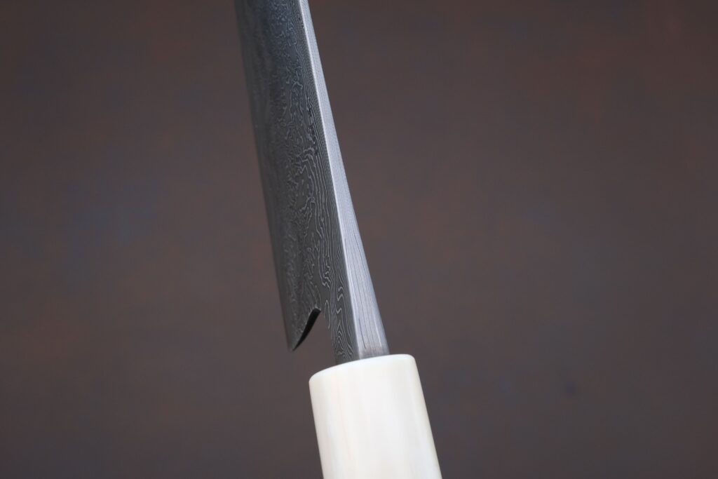 Nach dem Schmiedeprozess wurde das Messer grobgeschliffen und wärmebehandelt, einschließlich Härten und Anlassen des Stahls. Dieser Prozess sorgt für eine außergewöhnliche Verschleißfestigkeit. Der Volldamast erreicht eine durchschnittliche Härte von 63.5 HRC, die durch zahlreiche Messungen mit dem UCI-Härteprüfgerät Sonodur 3 exakt bestimmt wurde.
