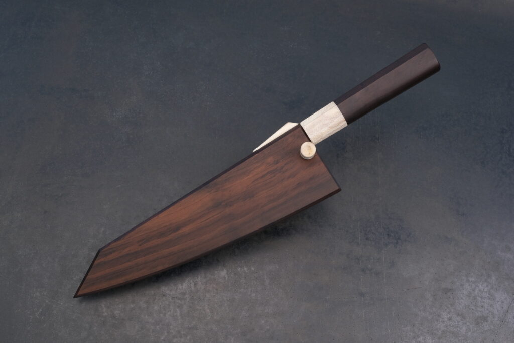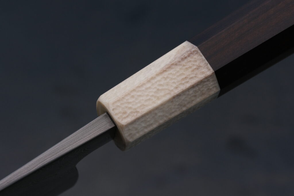 Der oben kantige und unten gerundete Griff Deines Gemüsemessers sorgt für präzise Kontrolle und angenehme Greifbarkeit, ohne die Bewegungsfreiheit einzuschränken. Der vordere Griffbereich, die sogenannte Zwinge, besteht aus stabilisiertem Rentierhorn. Dort habe ich die Oberfläche mit einem Kugelfräser bearbeitet, wodurch ein Muster entsteht, das die Rutschfestigkeit des Griffs erhöht. Diese Texturierung nenne ich VolcaTex. Der hintere Teil des Griffs besteht aus Nussbaumholz (Bijouwood). Dank eines besonderen Verdichtungsverfahrens ist dieses Nussbaumholz extrem hart und weitgehend feuchtigkeitsbeständig. Alle Holzelemente habe ich mehrfach mit hochwertigem Holzöl behandelt, um sie für viele Einsätze zu schützen. Die Scheide besteht aus demselben Nussbaumholz und ist so präzise gefertigt, dass die Klinge spielfrei sitzt. Auch der Sicherungsstift ist aus Rentierhorn gefertigt.