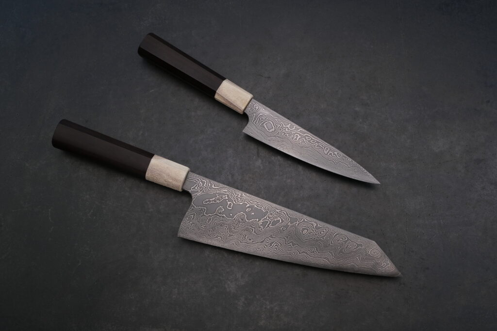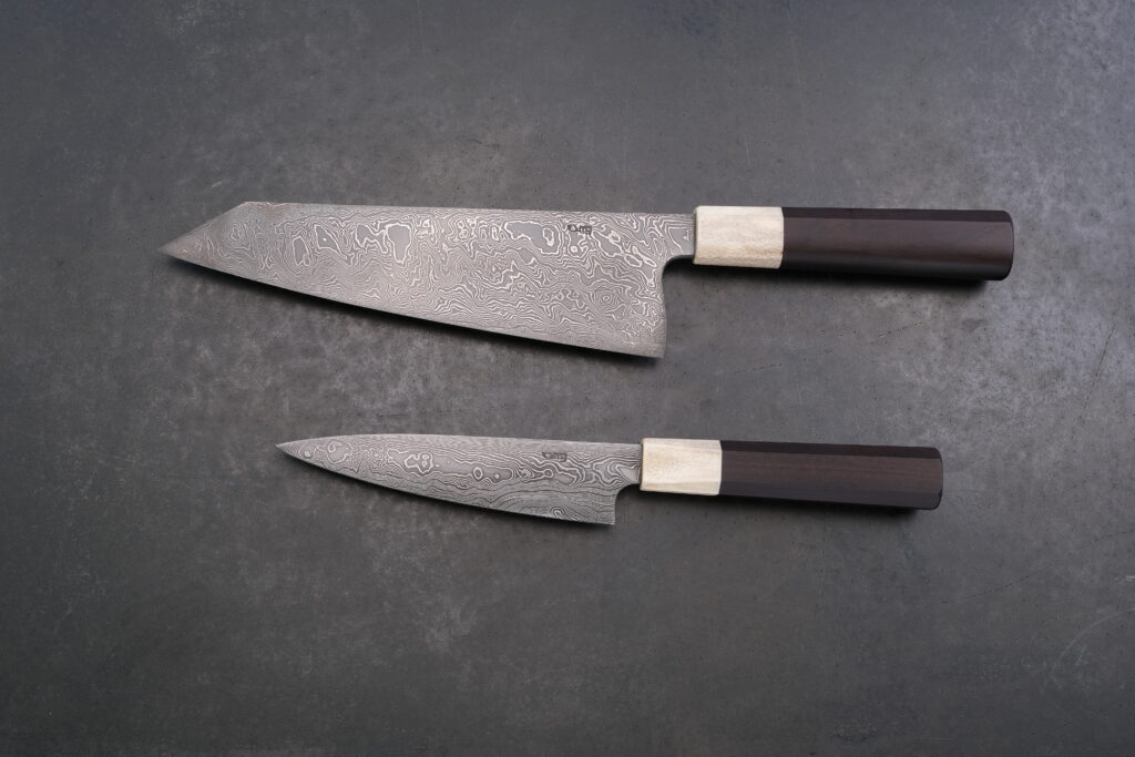 Gerade diese Kombination machte die Aufgabe so reizvoll: Ein Messerset für jemanden zu schaffen, der höchste technische Ansprüche mit einem klaren, unaufdringlichen Design vereint. Jedes Detail musste stimmen. Die Wahl des Damasts aus ApexUltra und Nickelstahl war dabei kein Zufall: ein Werkstoff, der Leistungsfähigkeit, Schärfe, Beständigkeit und Ästhetik in sich vereint – genau passend zu diesem Anspruch.