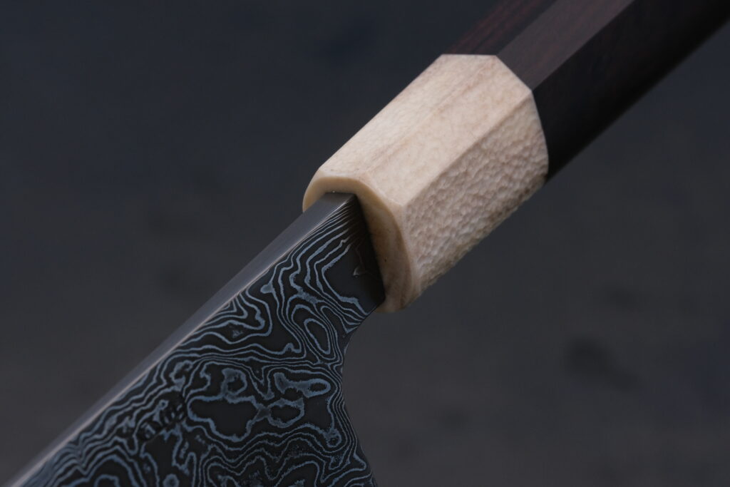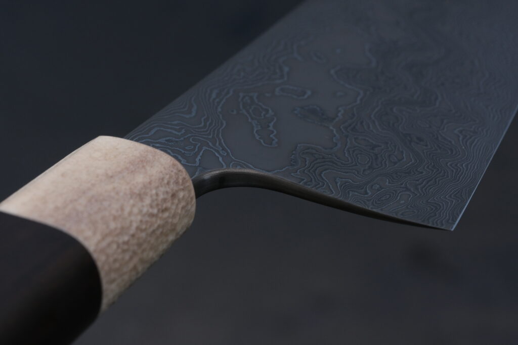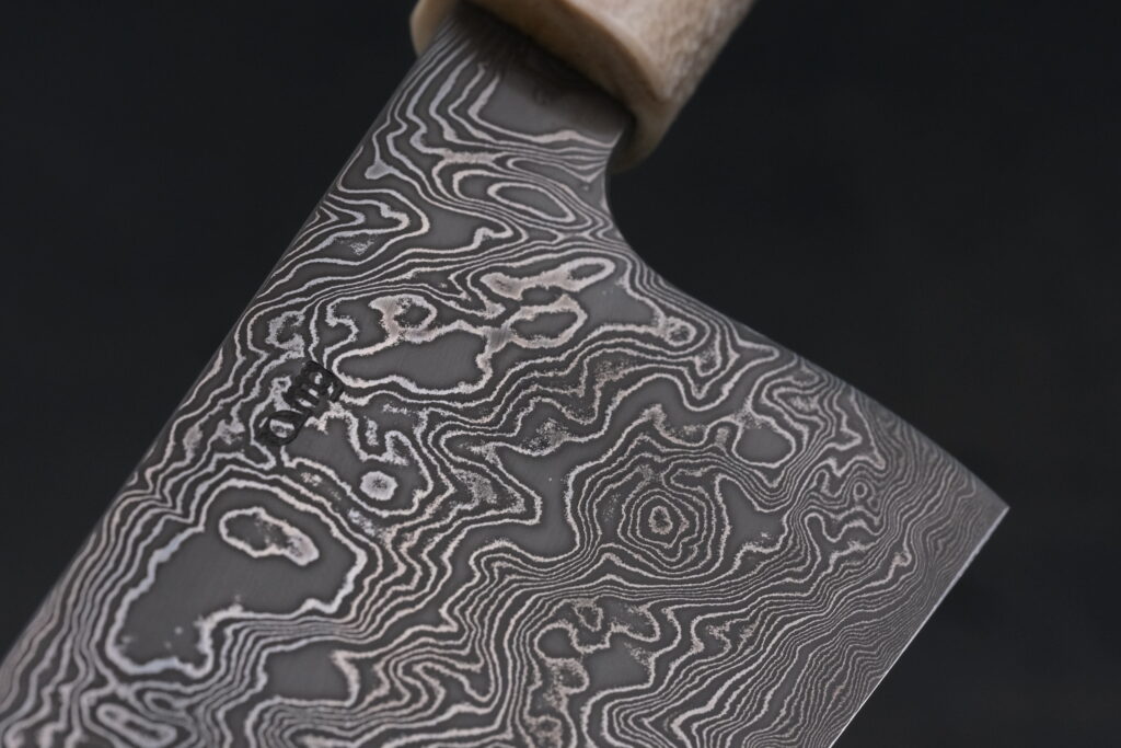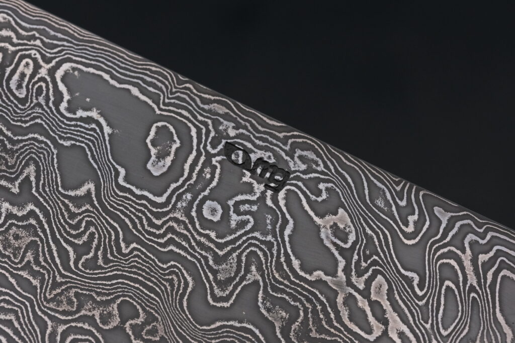 Die Klinge besteht aus einem Hochleistungsdamast mit ca. 195 Lagen.