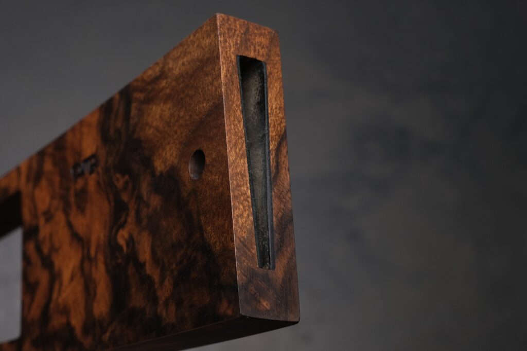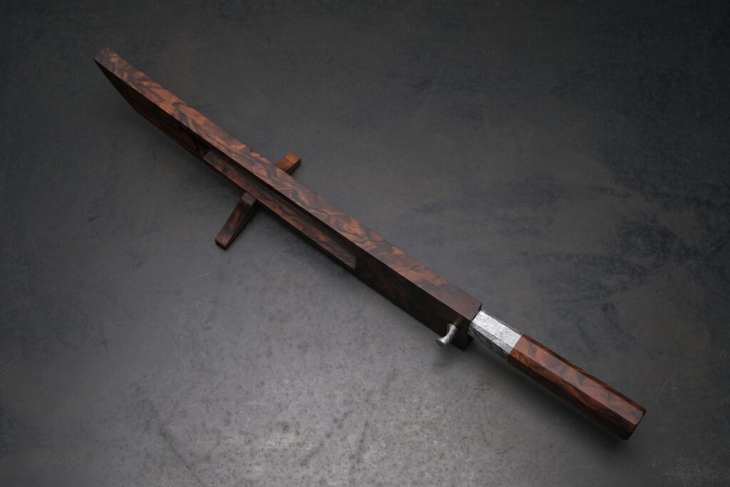 Die Scheide besteht ebenfalls aus türkischem Nussbaum und ist innen mit Leder gefüttert, um die Klinge zu schützen. Ein Sichtfenster gibt den Blick auf einen Teil der Klinge frei. Die Scheide ist so präzise gearbeitet, dass die Klinge spielfrei und sicher sitzt. Auch der Sicherungsstift ist aus Muonionalusta-Meteorit gefertigt.