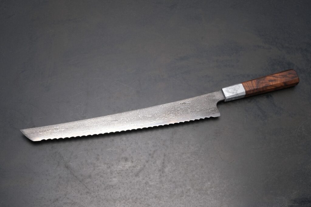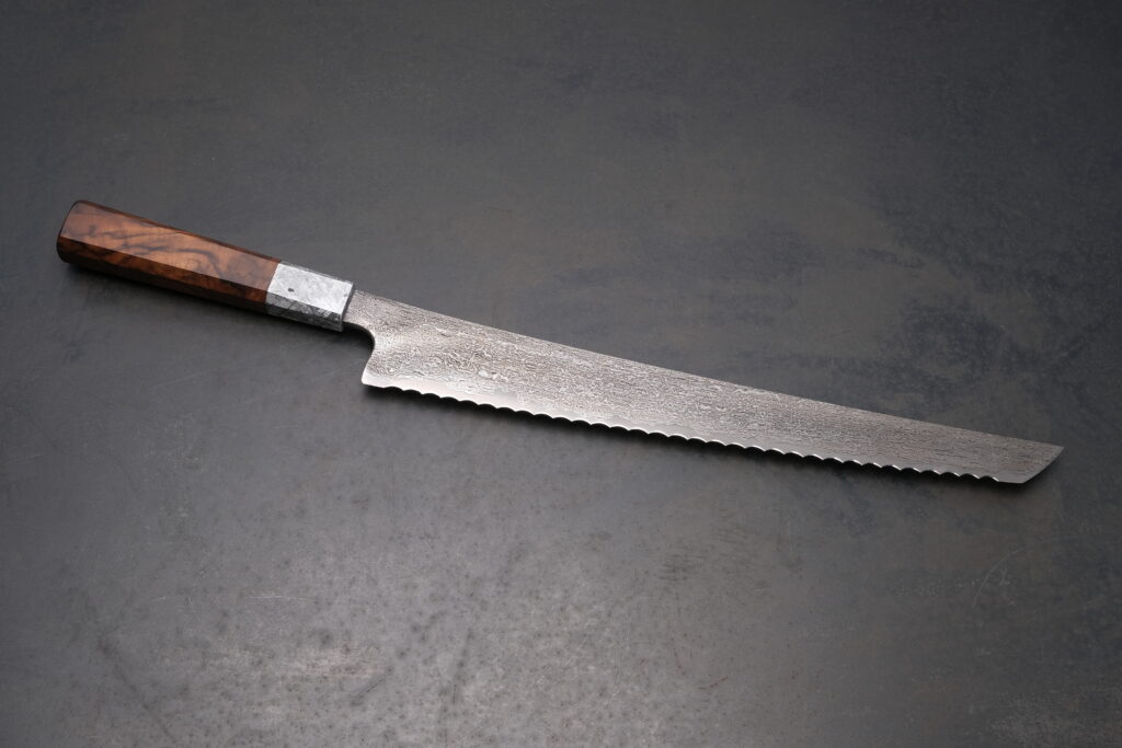 Das besondere an den Brotmesser aus meiner Hand ist der beidseitig angebrachte Wellenschliff. Dank dieses symmetrischen Wellenschliffs gelingt jedes Schnittresultat überaus präzise. Traditionelle bzw. einseitige Wellenschliffe führen oft zu asymmetrischen Scheibendicken, da das Messer seitlich „weg zieht bzw. verläuft“. Die exzellent hohe Schärfe wird mit Hilfe einer winkelgeführten Präzisionseinrichtung und diversen Schärfstein-Feinheiten ausgeführt. Jede einzelne Welle wurde beidseitig und symmetrisch innerhalb mehreren Durchgängen geschliffen. Selbstverständlich geschieht dieser wichtige Vorgang ausschließlich wassergekühlt und somit bei Raumtemperatur.