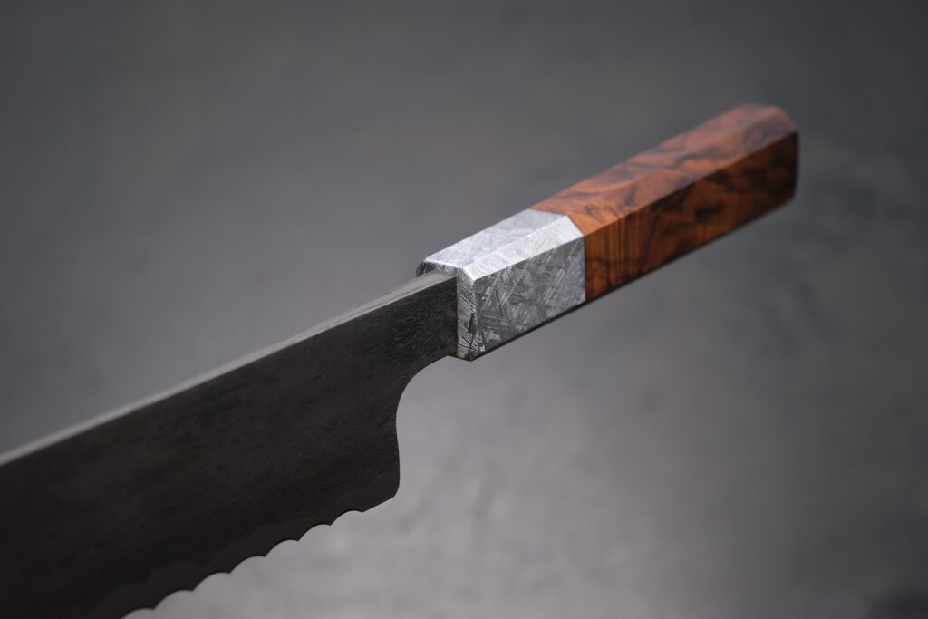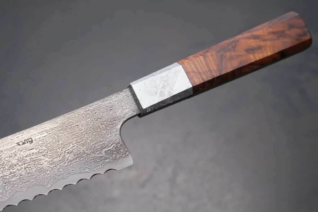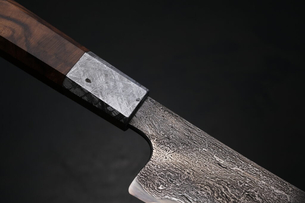 Der achtkantige Griff dieses Messers liegt präzise und angenehm in der Hand. Er ist aus Muonionalusta-Meteorit und türkischem Nussbaum gefertigt und verbindet markante Formgebung mit sicherer Führung.