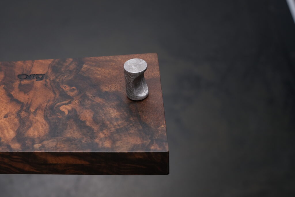 Die Klinge besteht aus drei Lagen – mit einem Kern aus ApexUltra, eingefasst in Damast aus Meteorit Muonionalusta und Stahlpulver. Sie trägt die Ewigkeit in sich. Der Griff aus türkischem Nussbaum und massivem Meteorit erzählt von Ursprung und Eleganz. Dieses Messer ist mehr als ein Begleiter – es ist ein Symbol für den Anspruch, das Leben mit Liebe zum Detail und höchsten Ansprüchen zu bereichern.